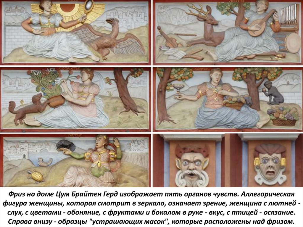 Фриз на доме Цум Брайтен Герд изображает пять органов чувств. Аллегорическаяфигура женщины, которая смотрит в зеркало, означает зрение, женщина с лютней слух, с цветами - обоняние, с фруктами и бокалом в руке - вкус, с птицей - осязание.