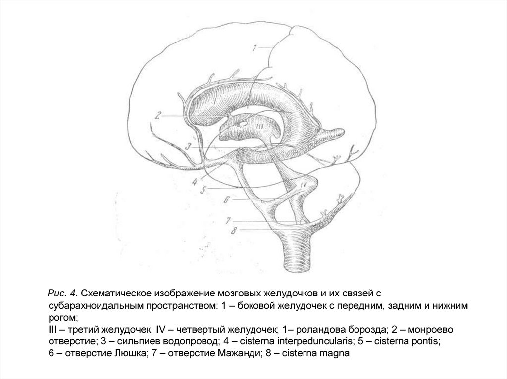 Рис. 4. Схематическое изображение мозговых желудочков и их связей ссубарахноидальным пространством: 1 – боковой желудочек с передним, задним и нижним