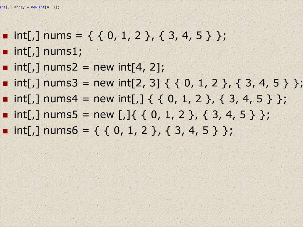 int[,] nums4 = new int[,] { { 0, 1, 2 }, { 3, 4, 5 } };