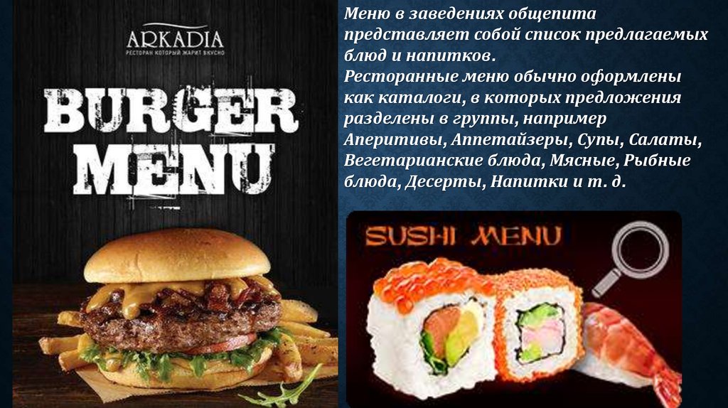 Меню в заведениях общепитапредставляет собой список предлагаемых