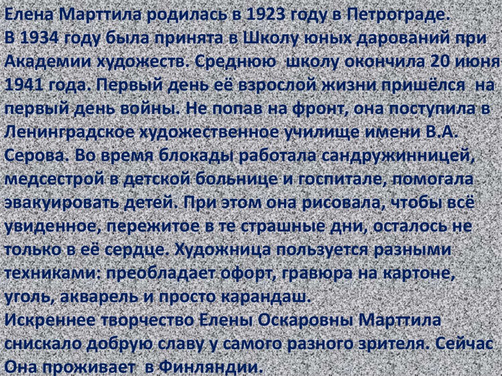 Елена Марттила родилась в 1923 году в Петрограде.В 1934 году была принята в Школу юных дарований при