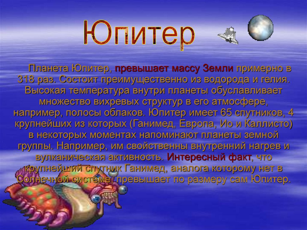 Планета Юпитер, превышает массу Земли примерно в318 раз. Состоит преимущественно из водорода и гелия.