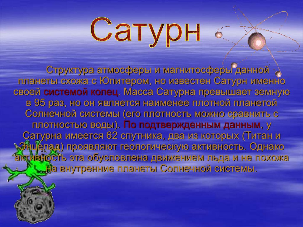 Структура атмосферы и магнитосферы даннойпланеты схожа с Юпитером, но известен Сатурн именно