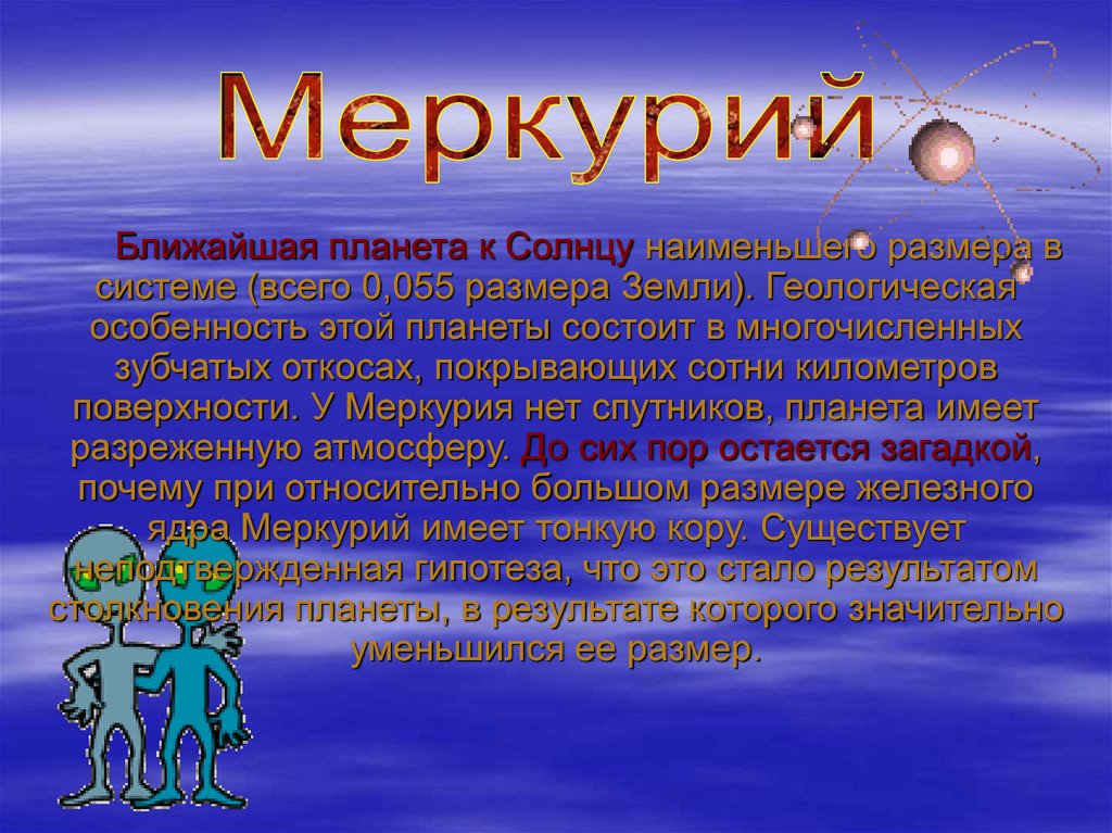 Ближайшая планета к Солнцу наименьшего размера всистеме (всего 0,055 размера Земли). Геологическая