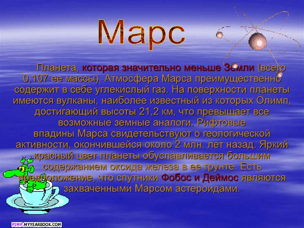 Планета, которая значительно меньше Земли (всего0,107 ее массы). Атмосфера Марса преимущественно