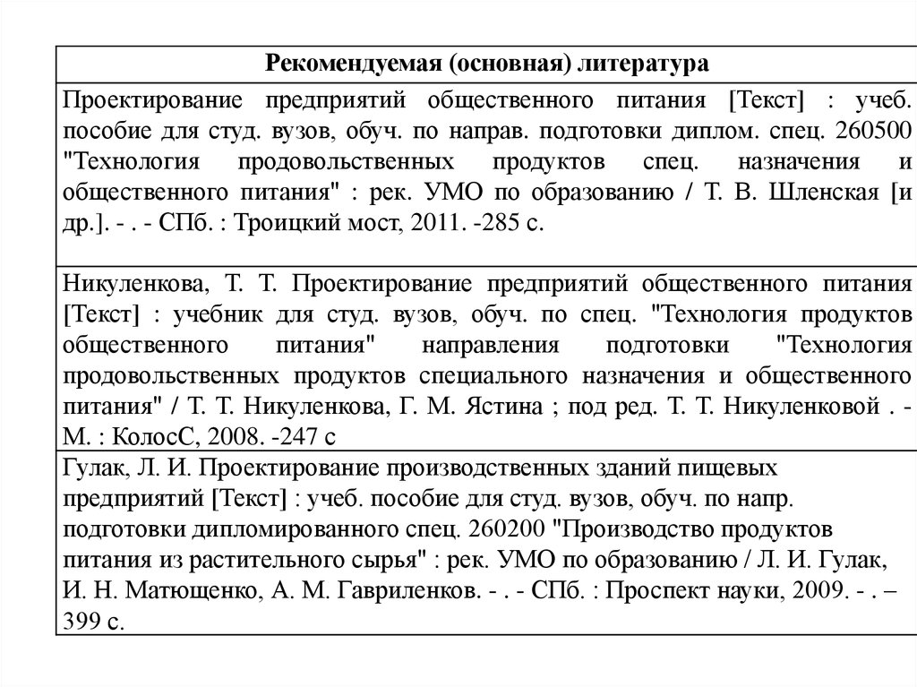Рекомендуемая (основная) литератураПроектирование предприятий общественного питания [Текст] : учеб.