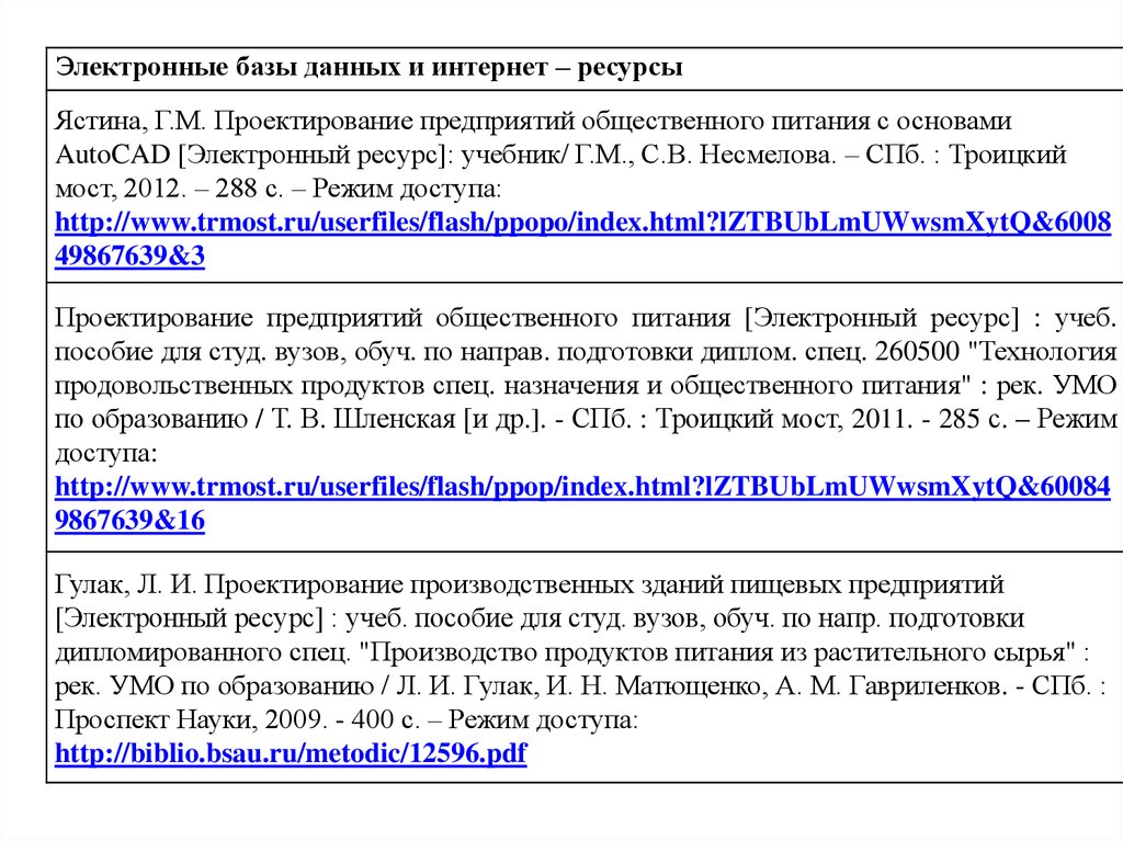 Электронные базы данных и интернет – ресурсыЯстина, Г.М. Проектирование предприятий общественного питания с основами
