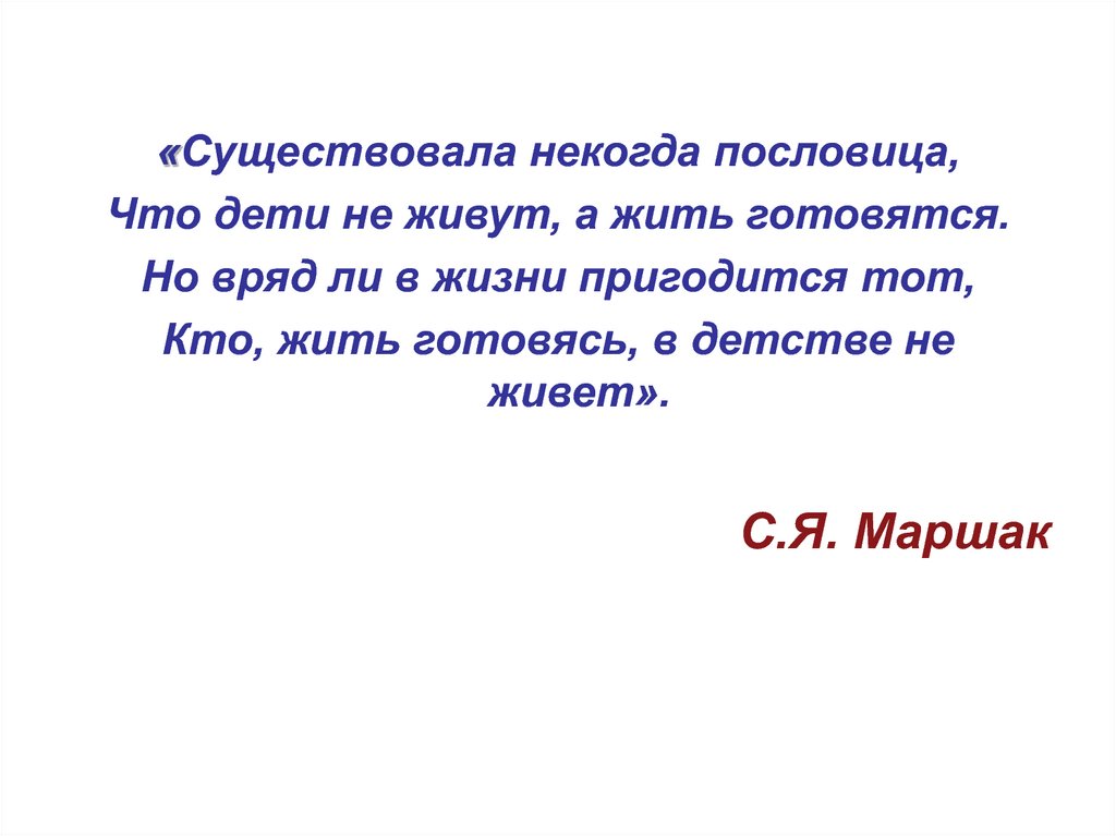 «Существовала некогда пословица,Что дети не живут, а жить готовятся.
