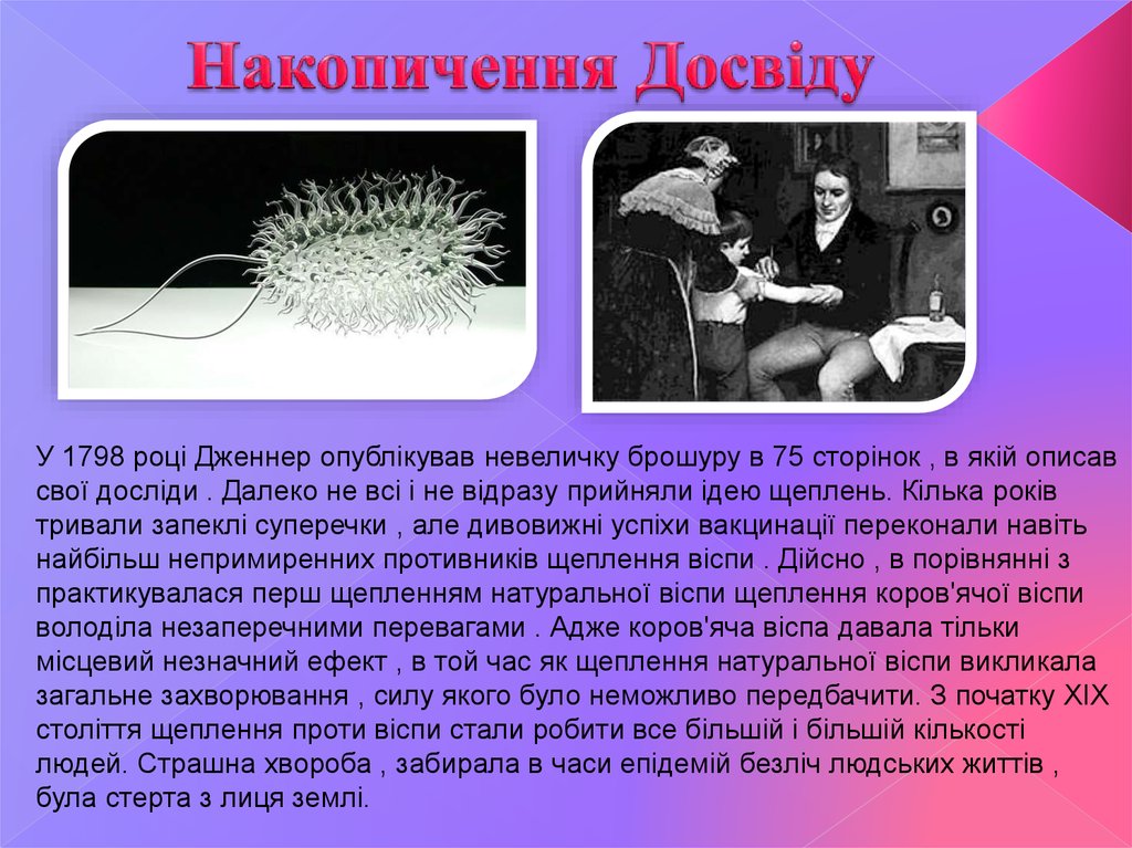 У 1798 році Дженнер опублікував невеличку брошуру в 75 сторінок , в якій описавсвої досліди . Далеко не всі і не відразу прийняли ідею щеплень. Кілька років
