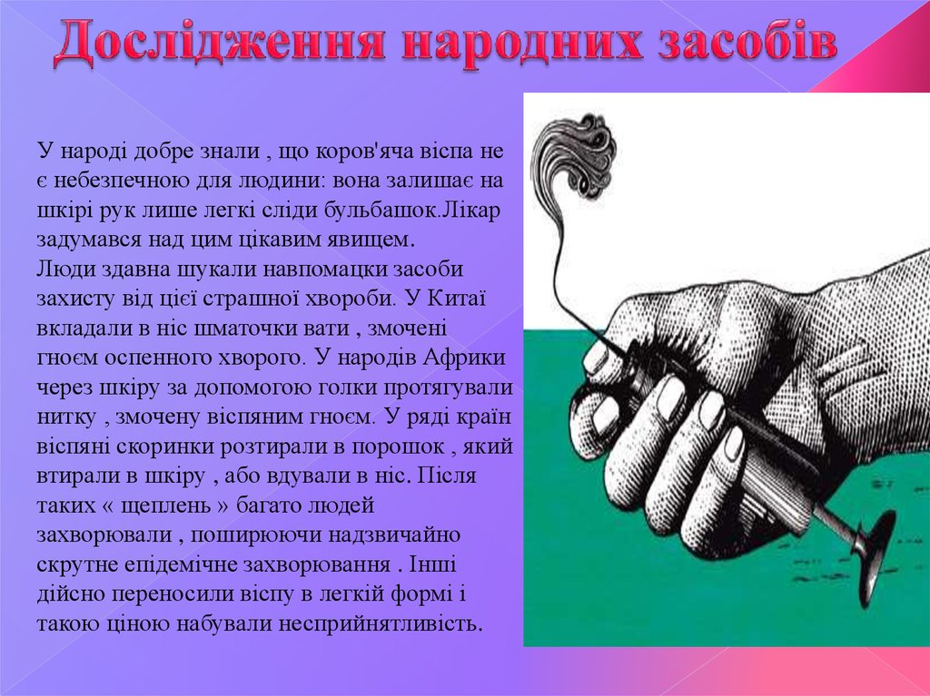У народі добре знали , що коров'яча віспа неє небезпечною для людини: вона залишає на