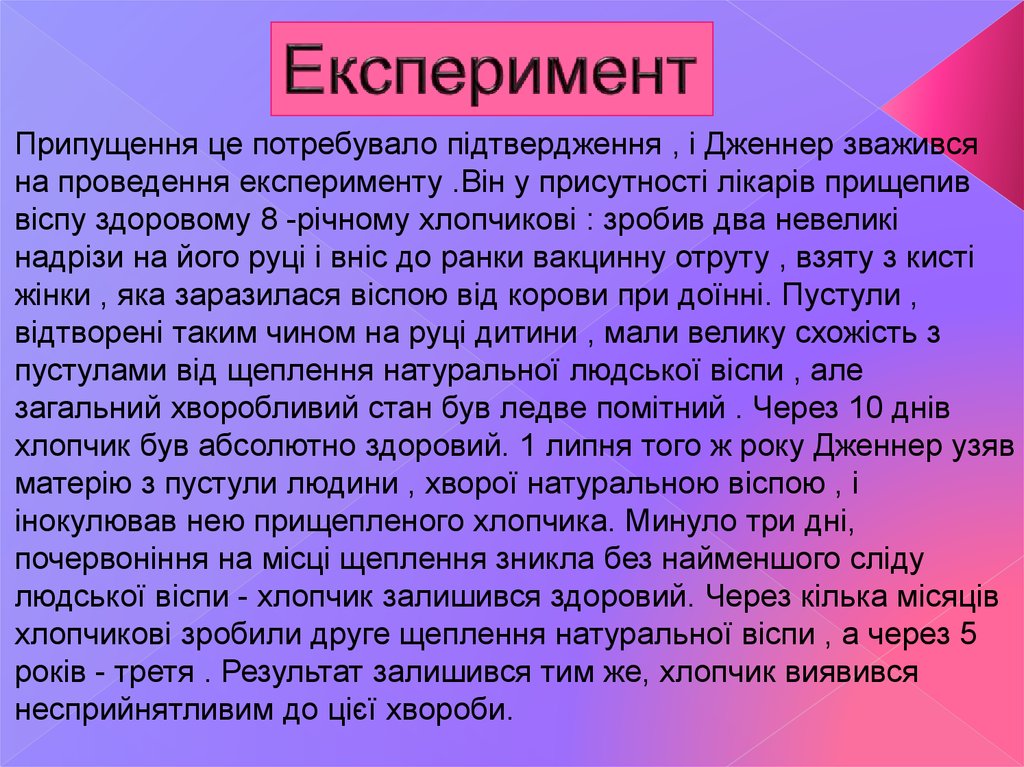 Припущення це потребувало підтвердження , і Дженнер зваживсяна проведення експерименту .Він у присутності лікарів прищепив