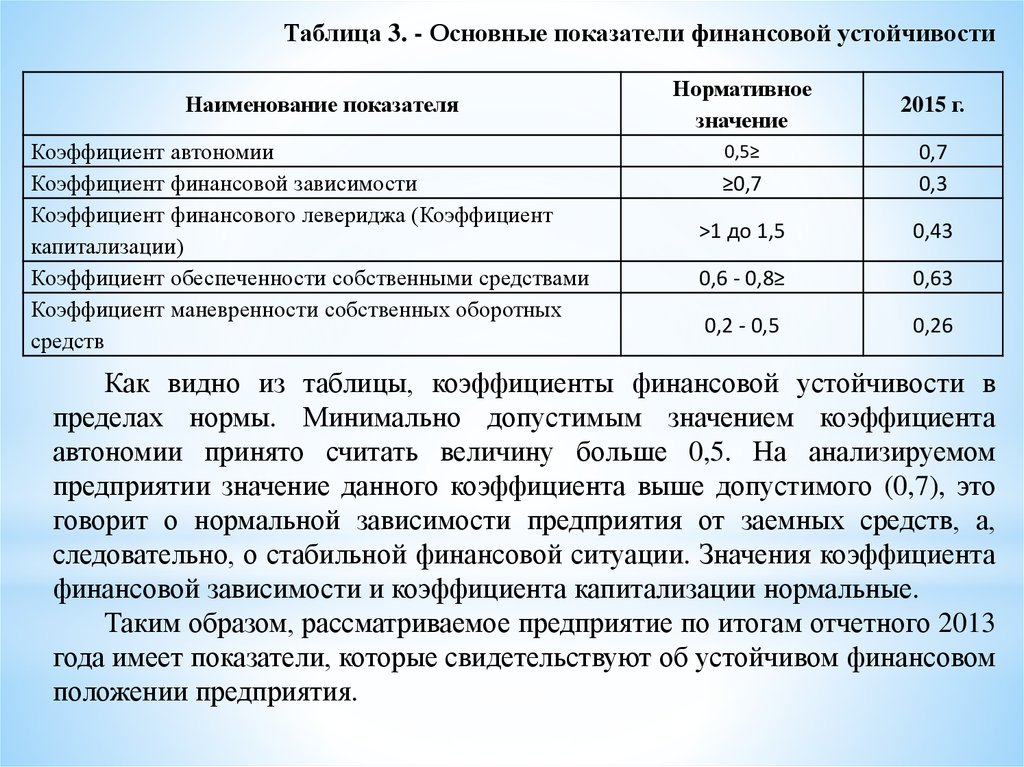 Таблица 3. - Основные показатели финансовой устойчивостиНаименование показателя