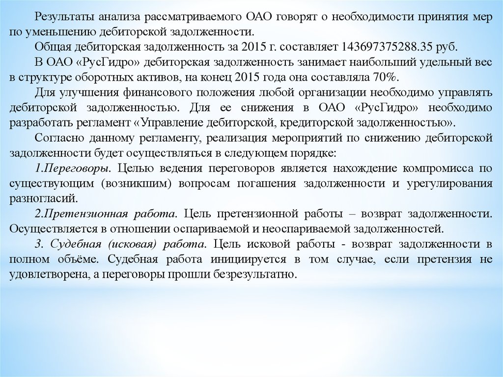 дебиторской задолженностью. Для ее снижения в ОАО «РусГидро» необходимо