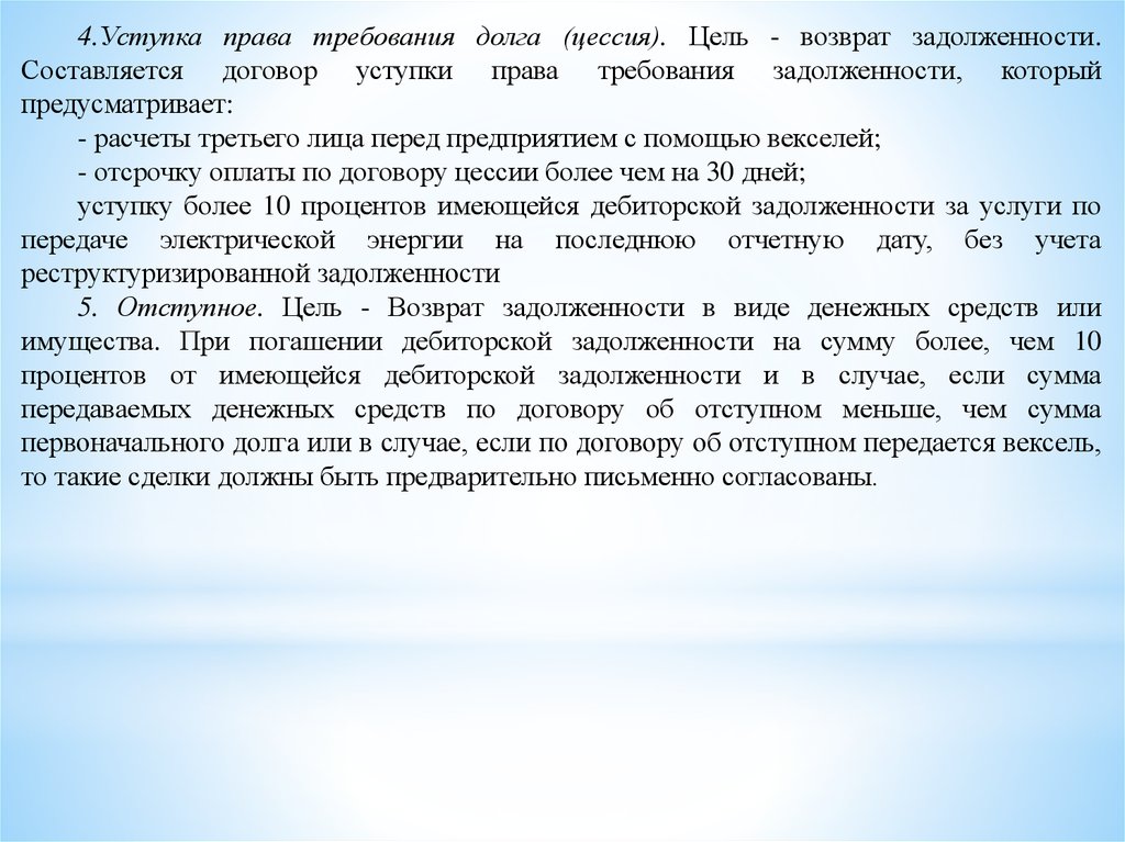 4.Уступка права требования долга (цессия). Цель - возврат задолженности.Составляется договор уступки права требования задолженности, который
