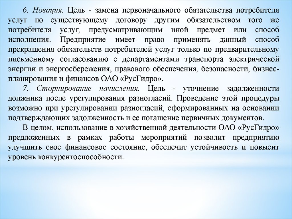 6. Новация. Цель - замена первоначального обязательства потребителяуслуг по существующему договору другим обязательством того же