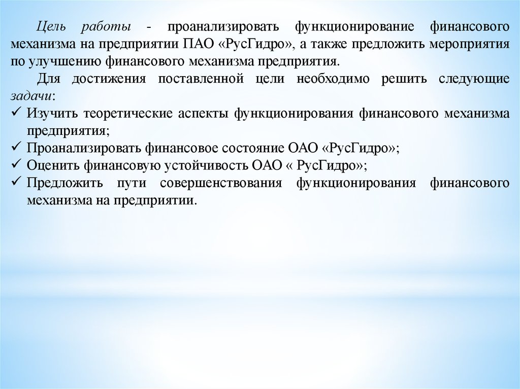 Цель работы - проанализировать функционирование финансовогомеханизма на предприятии ПАО «РусГидро», а также предложить мероприятия