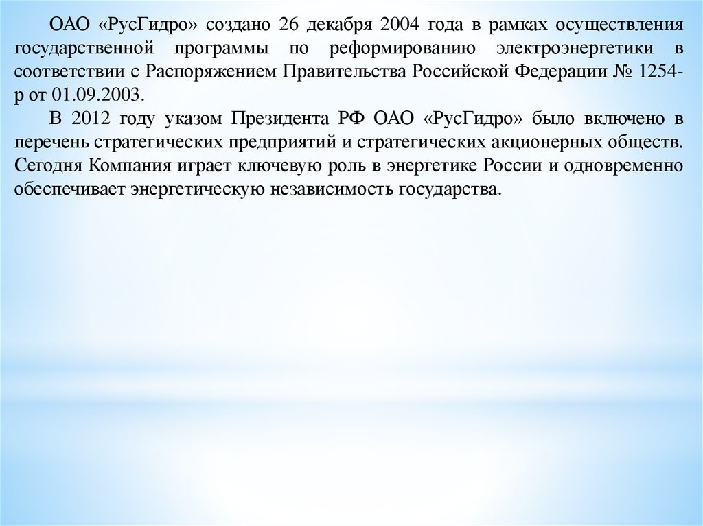 ОАО «РусГидро» создано 26 декабря 2004 года в рамках осуществлениягосударственной программы по реформированию электроэнергетики в