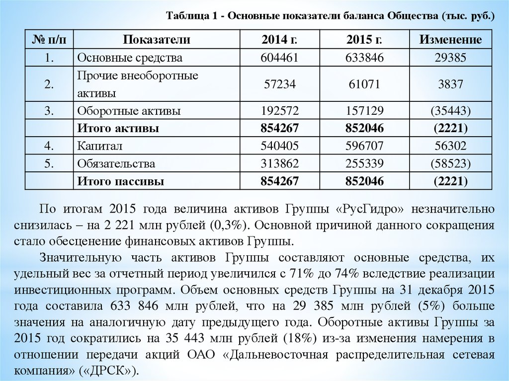 Таблица 1 - Основные показатели баланса Общества (тыс. руб.)№ п/п