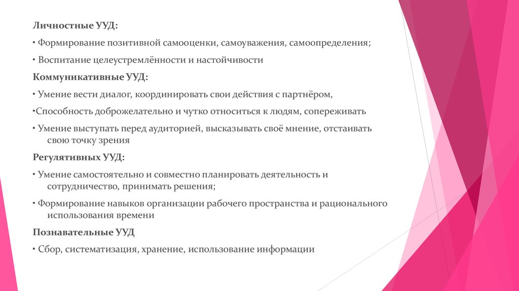 Личностные УУД:• Формирование позитивной самооценки, самоуважения, самоопределения;