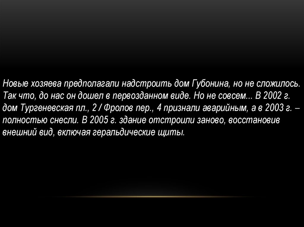 Новые хозяева предполагали надстроить дом Губонина, но не сложилось.Так что, до нас он дошел в первозданном виде. Но не совсем... В 2002 г.