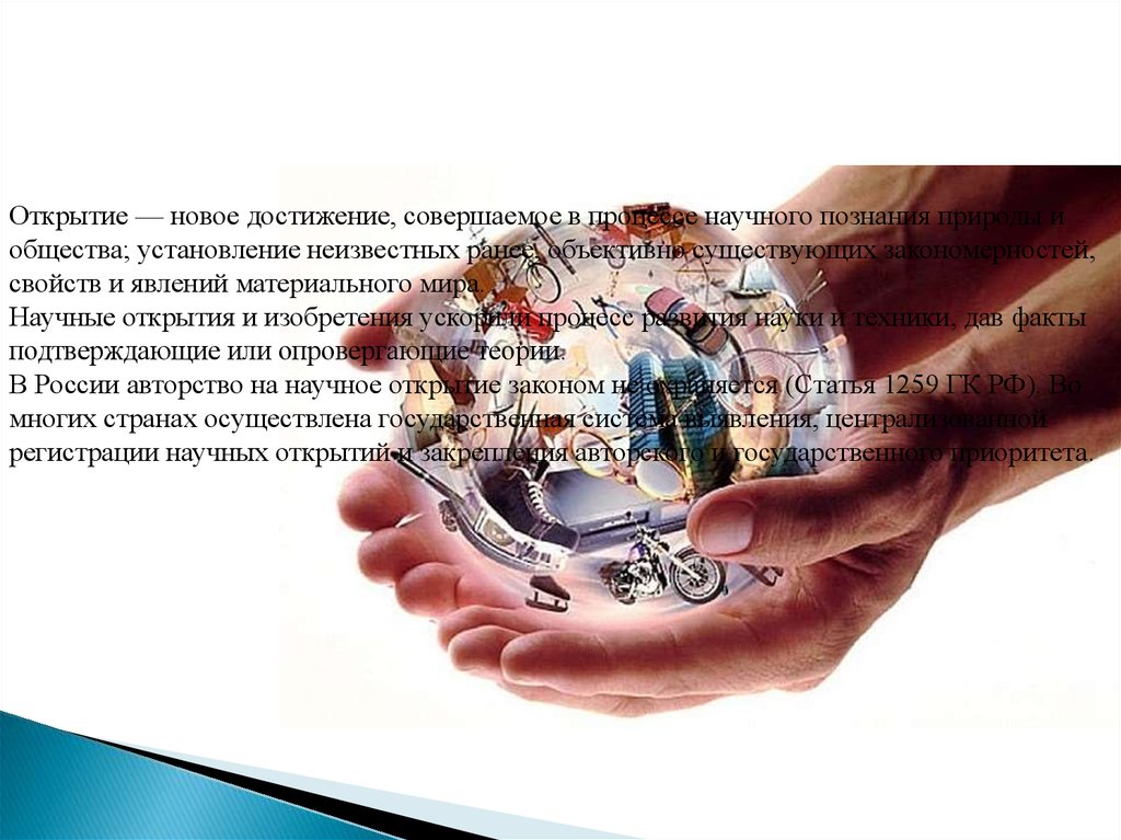 Открытие — новое достижение, совершаемое в процессе научного познания природы иобщества; установление неизвестных ранее, объективно существующих закономерностей,