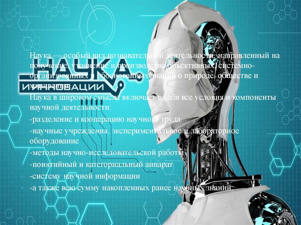 Наука — особый вид познавательной деятельности, направленный наполучение, уточнение и производство объективных, системноорганизованных и обоснованных знаний о природе, обществе и