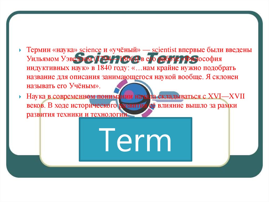 Термин «наука» science и «учёный» — scientist впервые были введеныУильямом Уэвеллом (1794—1866)] в его работе «Философия