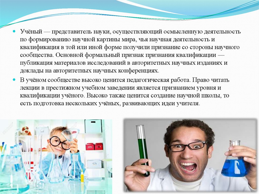 Учёный — представитель науки, осуществляющий осмысленную деятельностьпо формированию научной картины мира, чья научная деятельность и