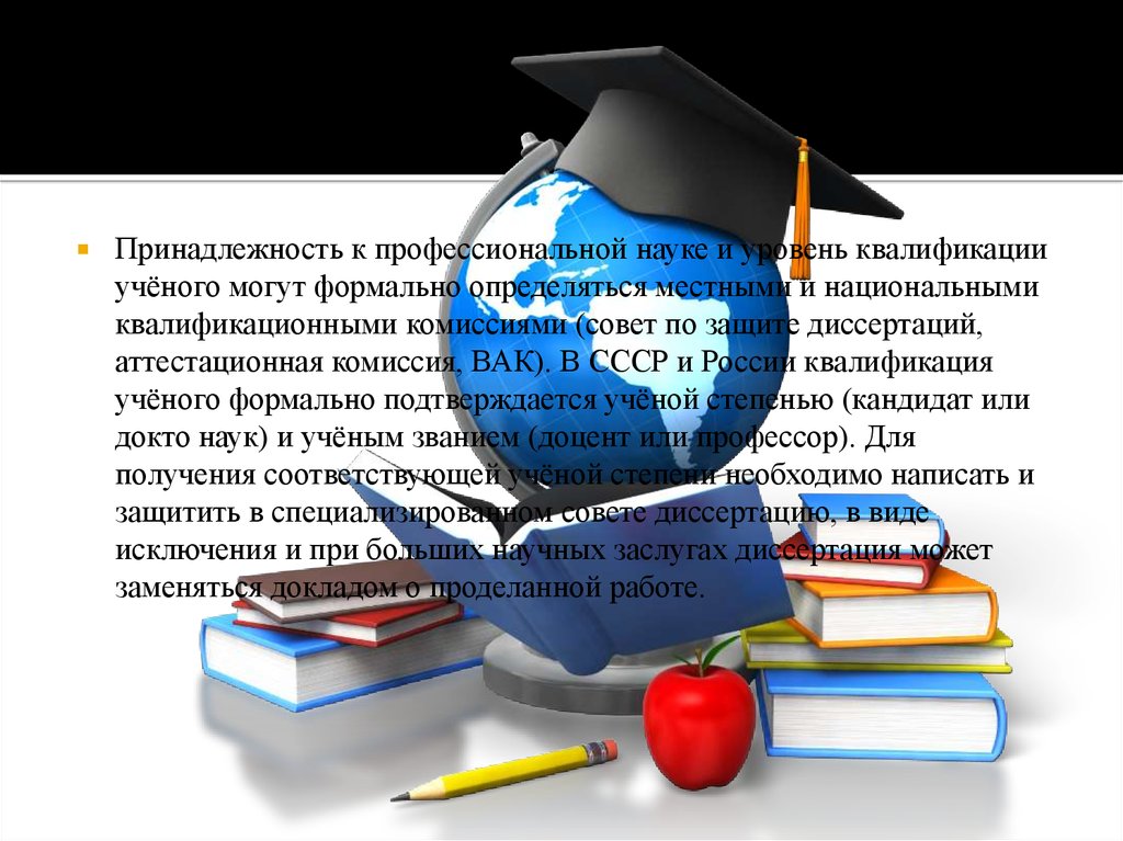 Принадлежность к профессиональной науке и уровень квалификацииучёного могут формально определяться местными и национальными