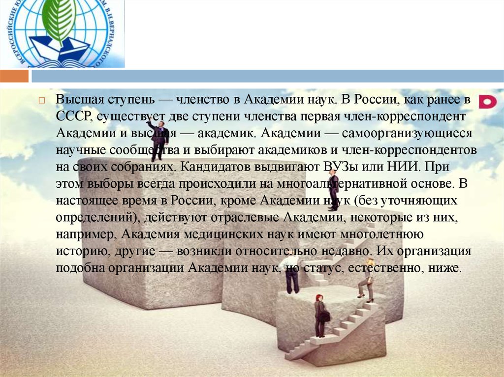 Высшая ступень — членство в Академии наук. В России, как ранее вСССР, существует две ступени членства первая член-корреспондент