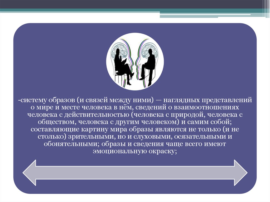 -систему образов (и связей между ними) — наглядных представленийо мире и месте человека в нём, сведений о взаимоотношениях
