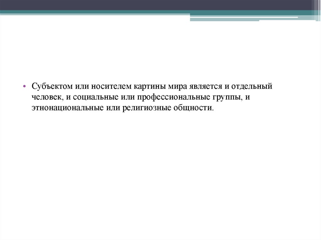 • Субъектом или носителем картины мира является и отдельныйчеловек, и социальные или профессиональные группы, и