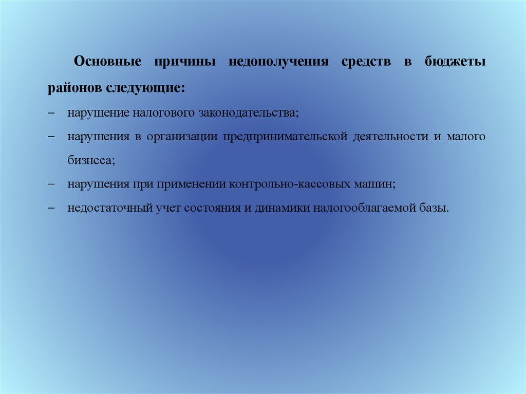 Основные причины недополучения средств в бюджетырайонов следующие: