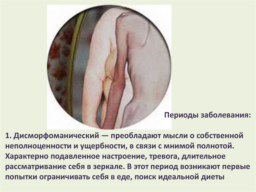 Периоды заболевания:1. Дисморфоманический — преобладают мысли о собственной