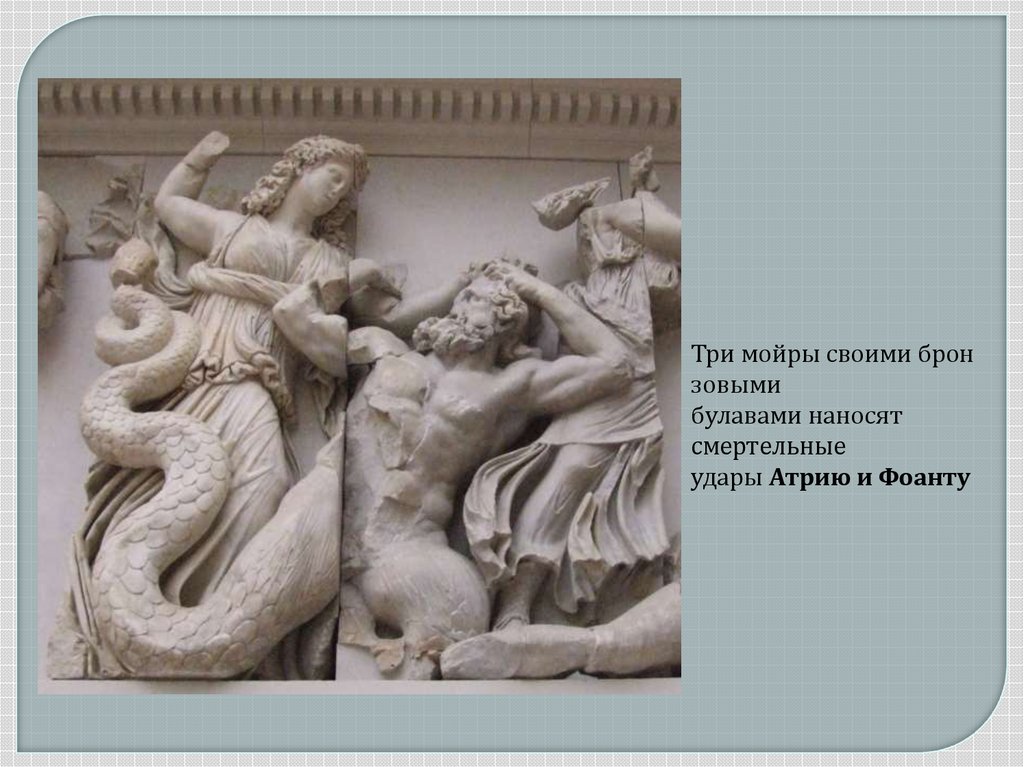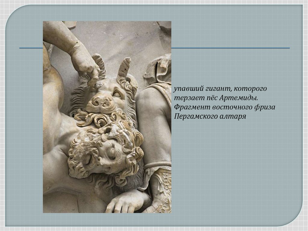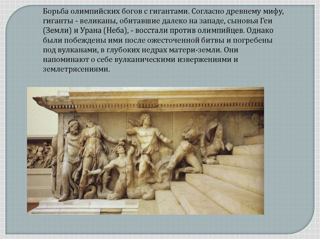 Борьба олимпийских богов с гигантами. Согласно древнему мифу,гиганты - великаны, обитавшие далеко на западе, сыновья Геи