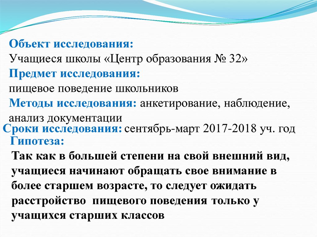 2. изучить расстройства пищевого поведения у школьников «Центр образования №32» г. Череповца