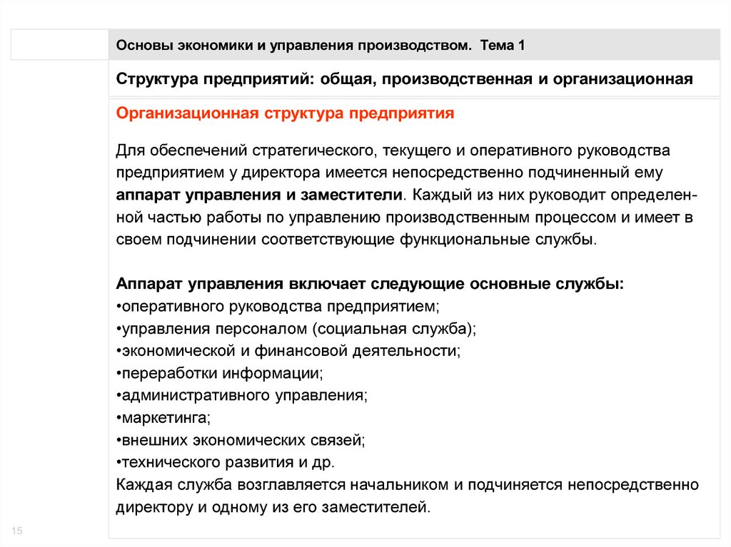 аппарат управления и заместители. Каждый из них руководит определенной частью работы по управлению производственным процессом и имеет в