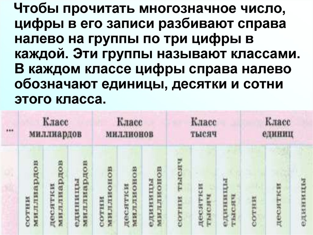 Чтобы прочитать многозначное число,цифры в его записи разбивают справа