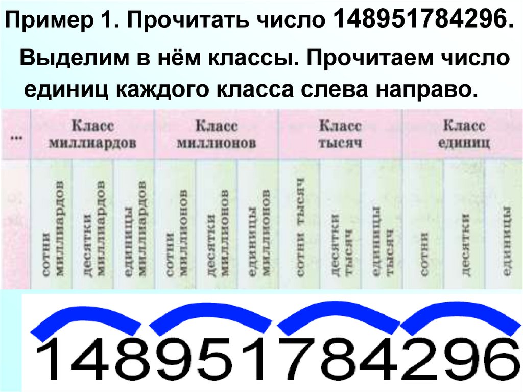 Пример 1. Прочитать число 148951784296.Выделим в нём классы. Прочитаем число