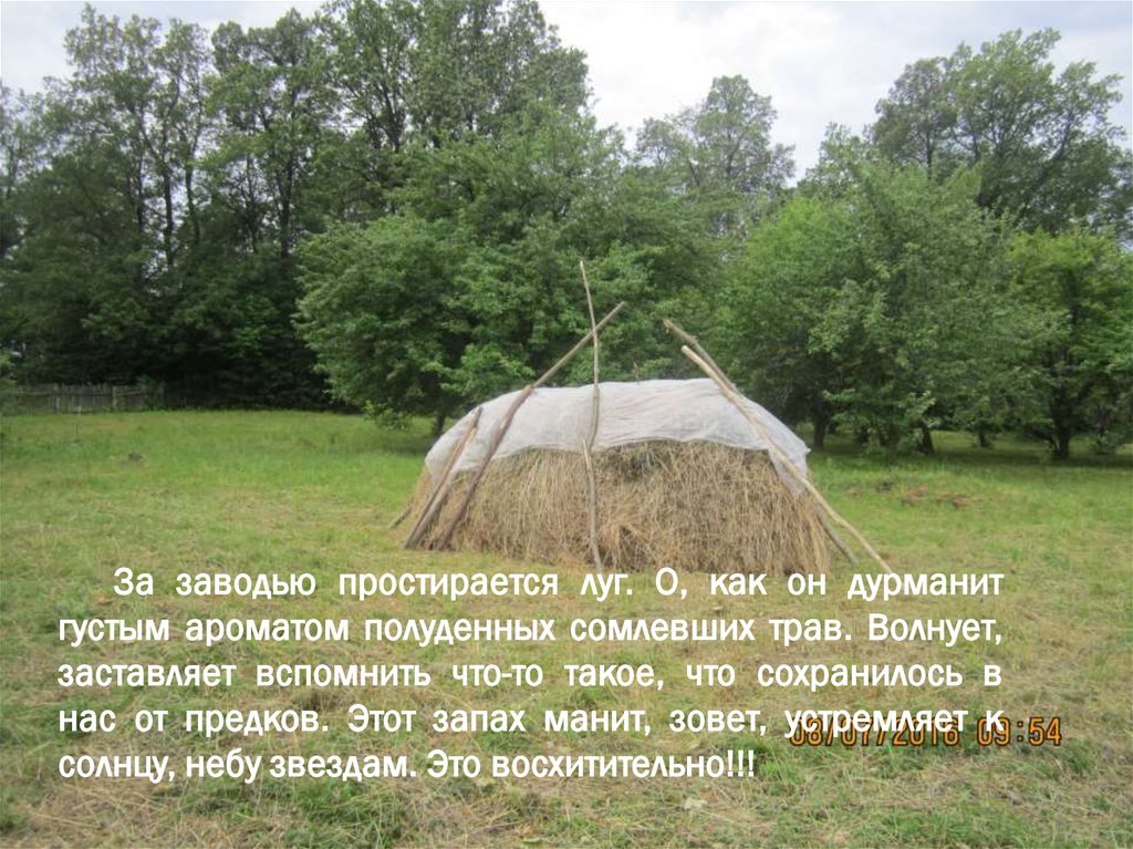 За заводью простирается луг. О, как он дурманитгустым ароматом полуденных сомлевших трав. Волнует,