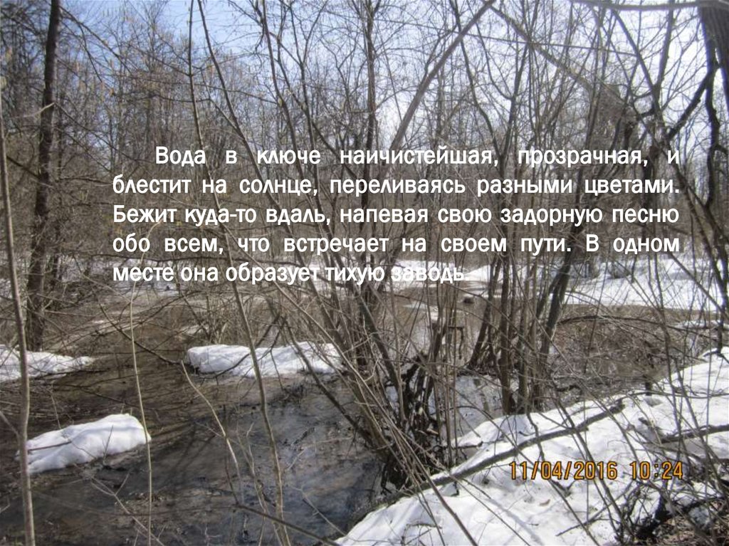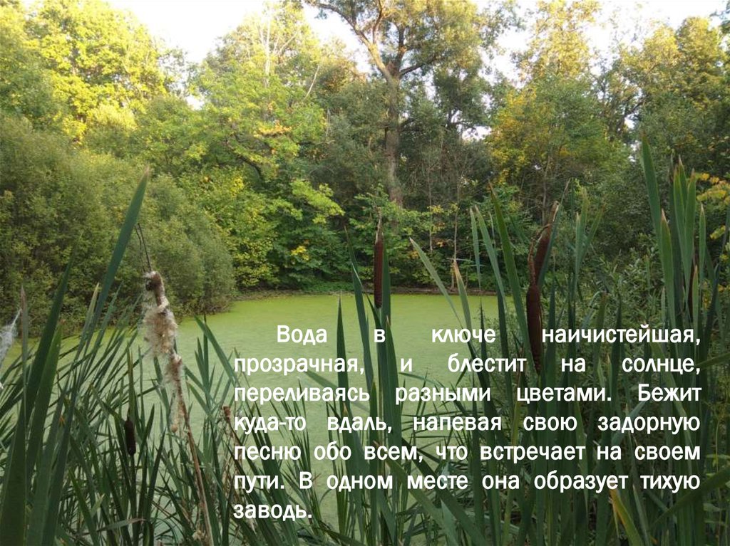 Вода в ключе наичистейшая, прозрачная, иблестит на солнце, переливаясь разными цветами.
