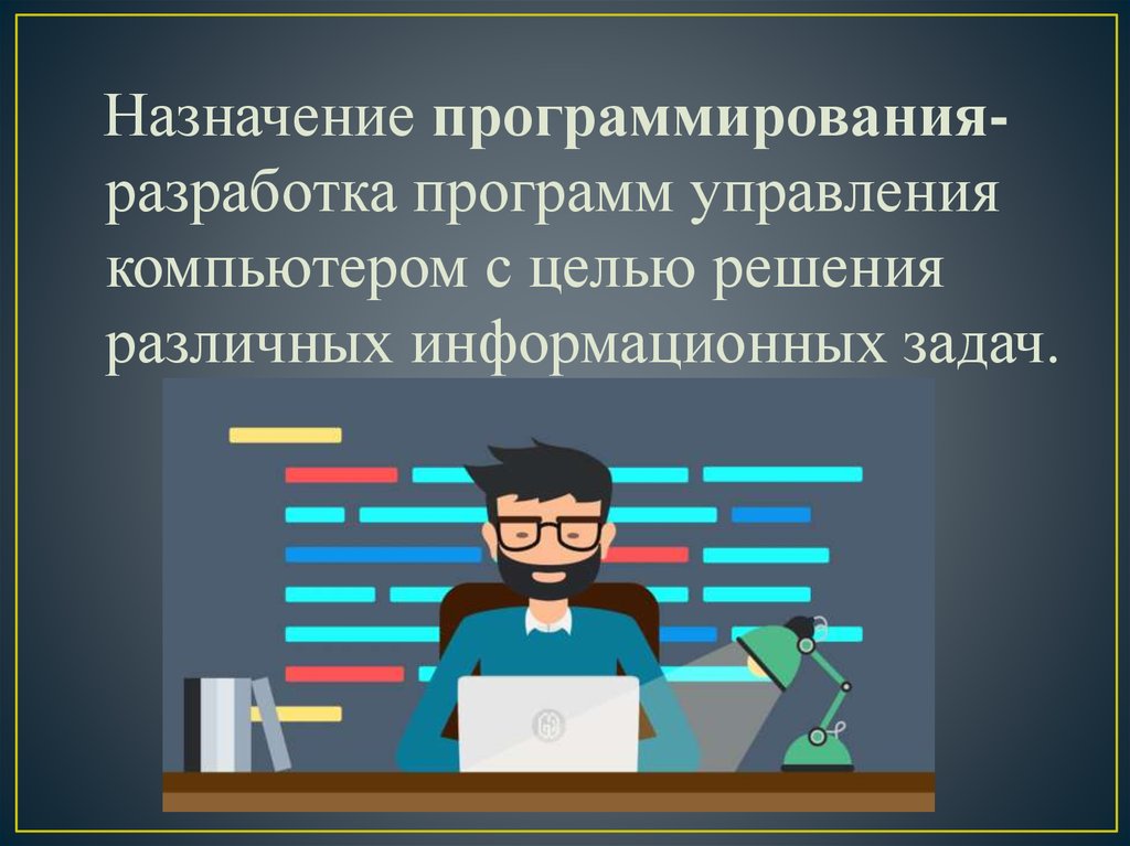 Назначение программированияразработка программ управлениякомпьютером с целью решения