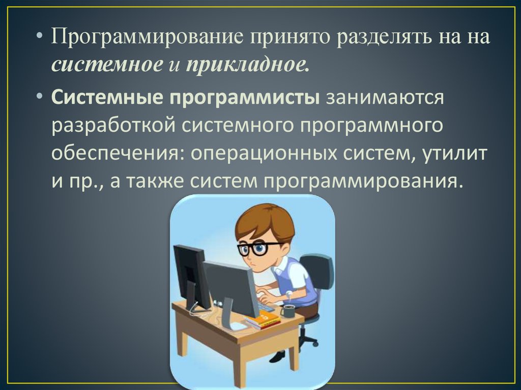 • Программирование принято разделять на насистемное и прикладное.