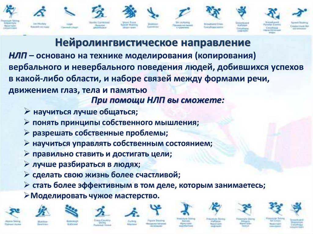 Нейролингвистическое направлениеНЛП – основано на технике моделирования (копирования)