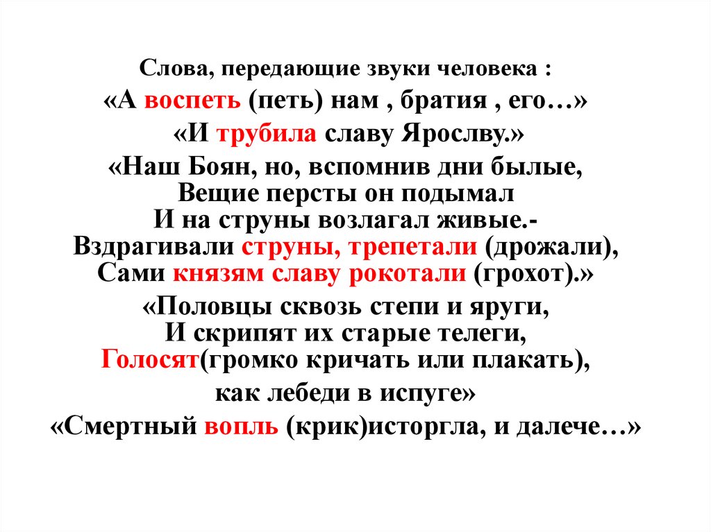 Слова, передающие звуки человека :«А воспеть (петь) нам , братия , его…»