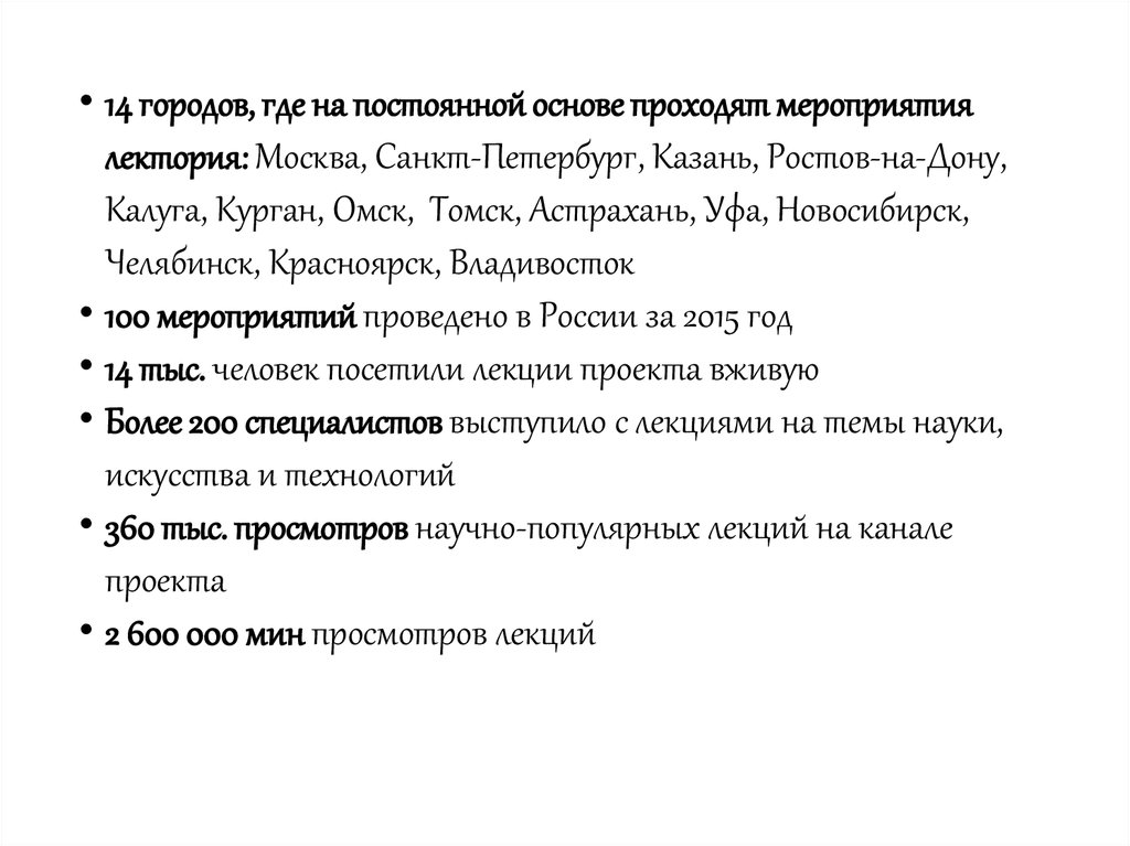 • 14 городов, где на постоянной основе проходят мероприятиялектория: Москва, Санкт-Петербург, Казань, Ростов-на-Дону,