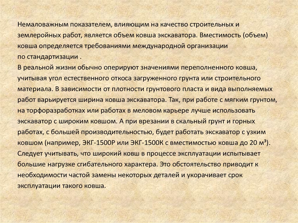 Немаловажным показателем, влияющим на качество строительных иземлеройных работ, является объем ковша экскаватора. Вместимость (объем)