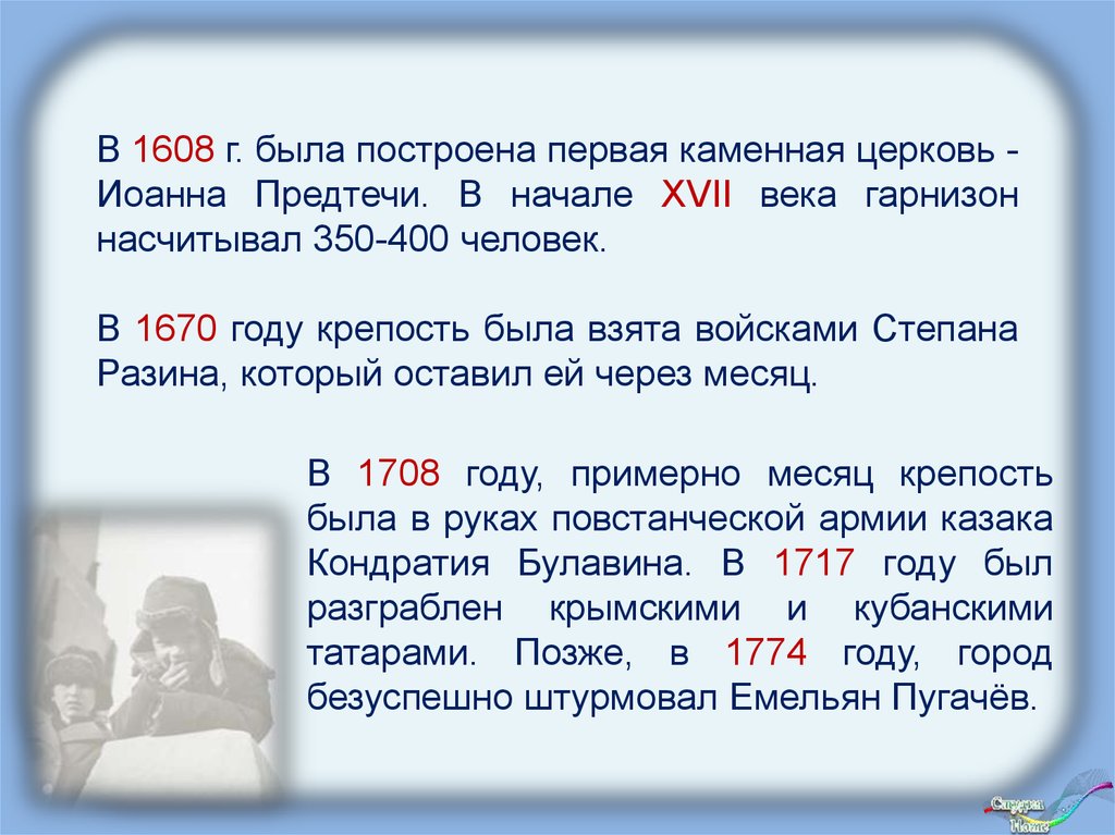 В 1608 г. была построена первая каменная церковь Иоанна Предтечи. В начале XVII века гарнизоннасчитывал 350-400 человек.