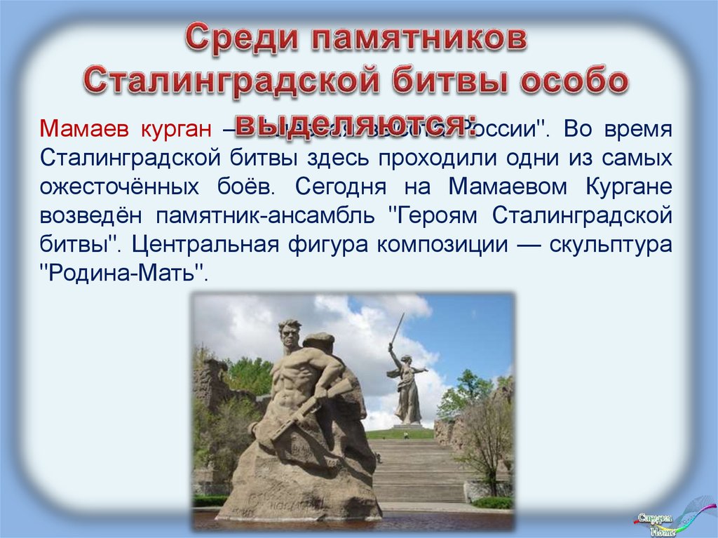 Мамаев курган — "главная высота России". Во времяСталинградской битвы здесь проходили одни из самых
