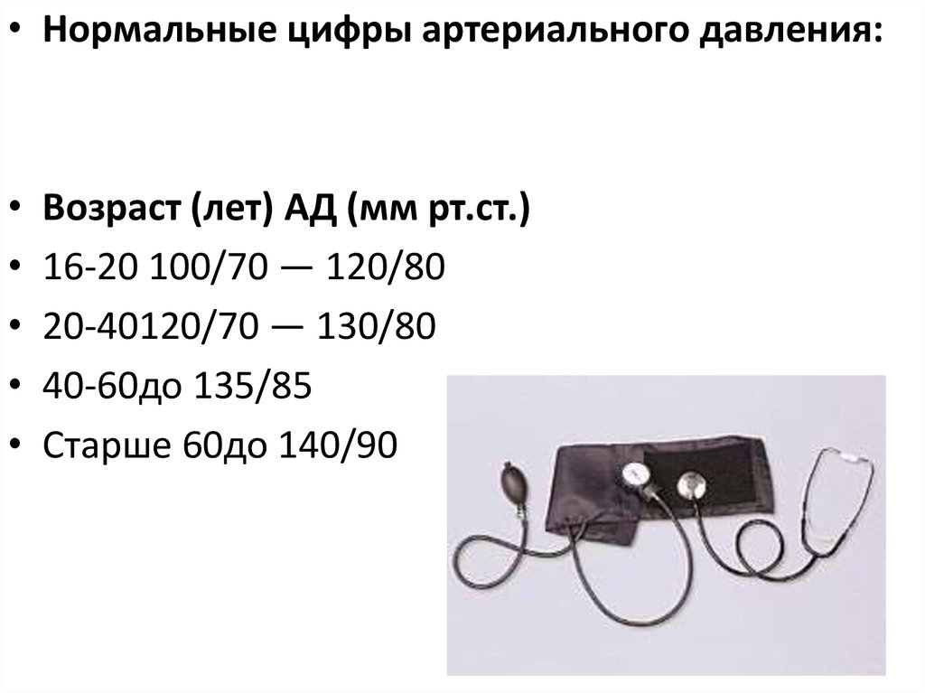 • Нормальные цифры артериального давления:Возраст (лет) АД (мм рт.ст.)